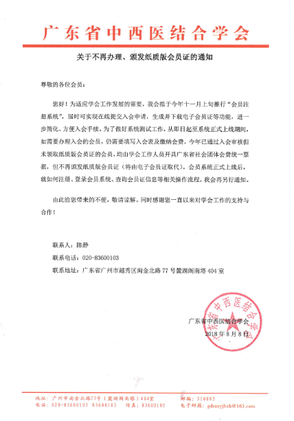 您好!为适应学会工作发展的需要,我会拟于今年十一月上旬推行“会员注册系统”,届时可实现在线提交入会申请,生成并下载电子会员证等功能,进一步简化、方便入会手续。为了做好系统测试工作,从即日起至系统正式上线期间,如需要办理入会的会员,仍需要填写入会表及缴纳会费,今年已通过入会审核但未领取纸质版会员证的会员,均由学会工作人员开具广东省社会团体会费统一票据,但不再颁发纸质版会员证(将由电子会员证取代)。会员系统正式上线后,就如何注册、登录会员系统、查询会员证信息等相关操作流程,我会再另行通知。